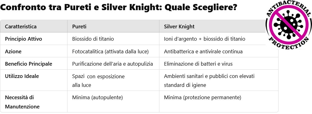 Se l'obiettivo è migliorare la qualità dell’aria e ridurre l’accumulo di sporco, Pureti è la scelta ideale. Se occorre una protezione antibatterica e antivirale continua senza bisogno di luce, Silver Knight è la soluzione perfetta.