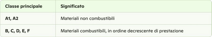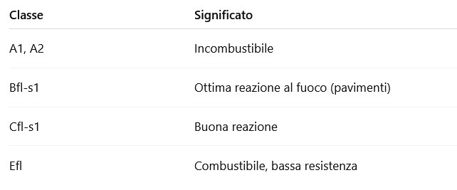 La norma suddivide i materiali in **Euroclassi**, dalla più sicura alla meno sicura: