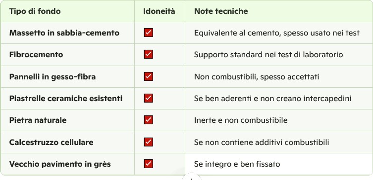 Il supporto conta: La maggior parte dei pavimenti certificati mantiene la classe Bfl-s1 se applicata su un supporto incombustibile (es. massetto cementizio o vecchia piastrella in ceramica).