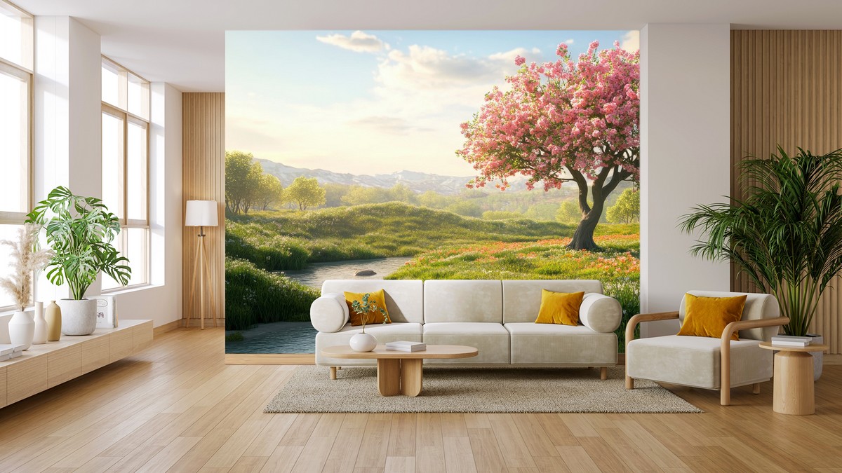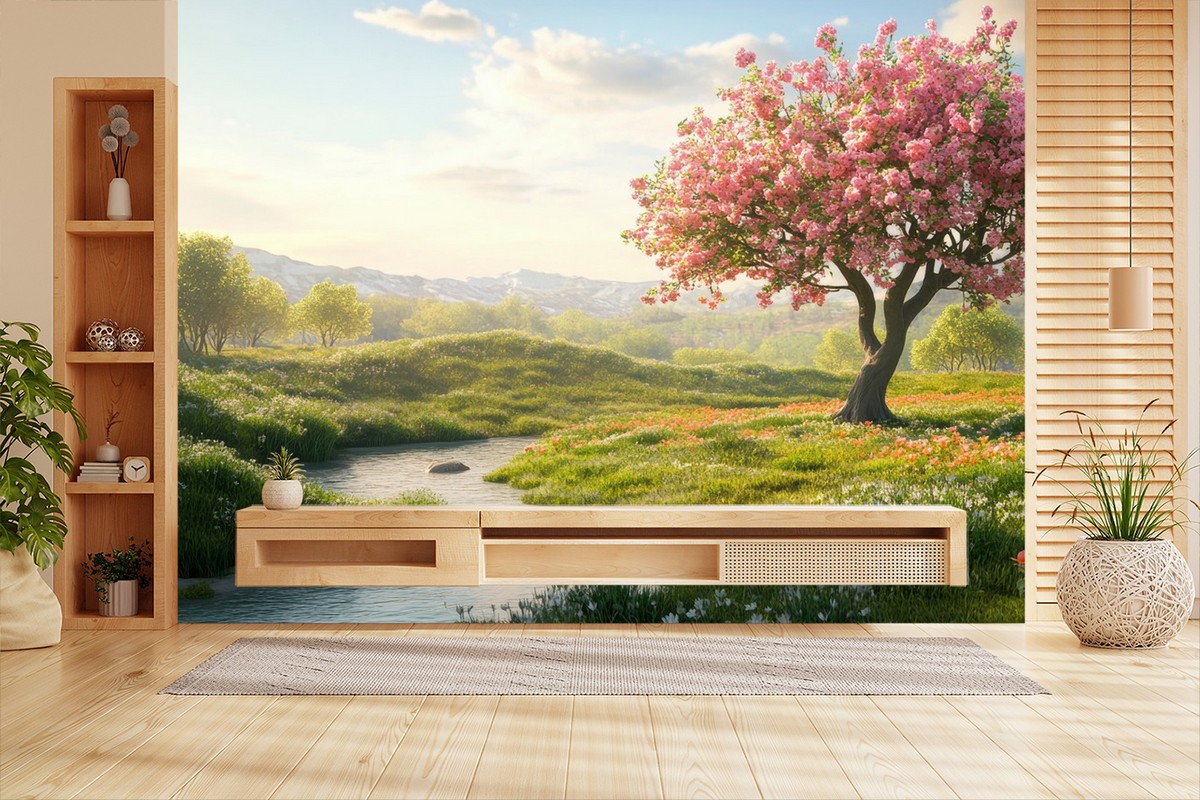 Carta da parati paesaggio con albero fiorito