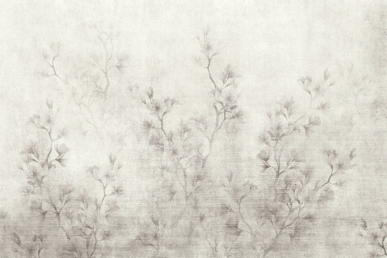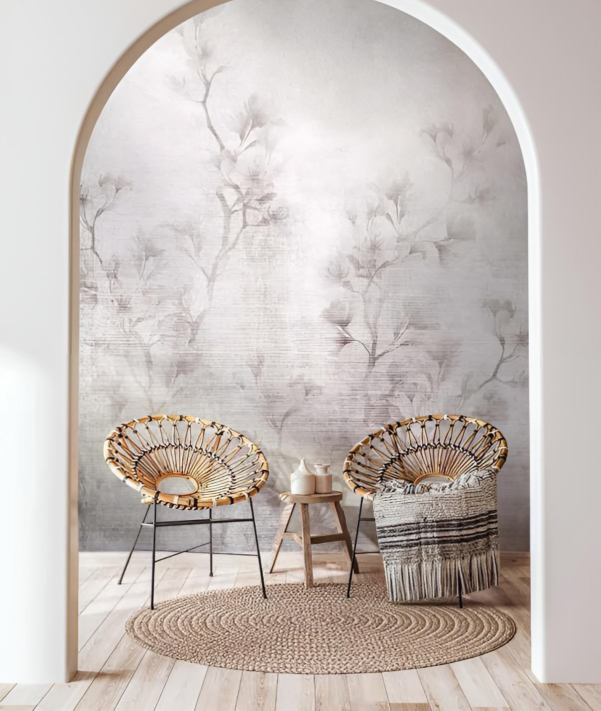 La carta da parati con fiori sfumati e delicati creano un’atmosfera naturale e rilassante. I fiori, che sembrano nascere dolcemente dal basso, aggiungono una sensazione di movimento e leggerezza, avvolgendo la stanza con un tocco di freschezza.